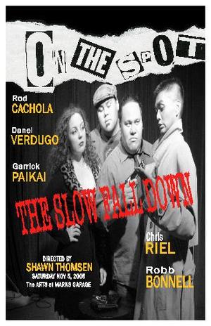 On the Spot created an anthology of improvised Film Noir stories from the 1940’s and 50’s called The Slow Fall Down in 2005 and later remounted its production in 2013. This Improvised theatrical show was a narrative based improv format that feature multiple stories happening under the same dark event happening in the fictional city much like graphic novel “Sin City.” However as Fans of the film Genre of the 1940’s and 50’s On the Spot’s rooted a many of their improvised narratives on some of their favorite Film Noir movies such as “D.O.A, Double Indemnity,” and “The Maltese Falcon.” the use of dark lighting and strong characters of the gerne